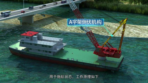 核心亮点,还得是甲板上那台100吨全回转起重机。距船尾8.8米精准安装,8.5米的尾部回转半径,1650吨米的最大起重力矩,甲板以上28米的起升高度,作业范围直接拉满。我们不妨看看它的“独门绝技”——A字架倒伏流程,五步操作环环相扣,从卷扬机放绳、吊臂归位,到防后倾装置折叠、油缸推动旋转,最终锁定在8.4米高度,刚好满足通航小于9米的要求。